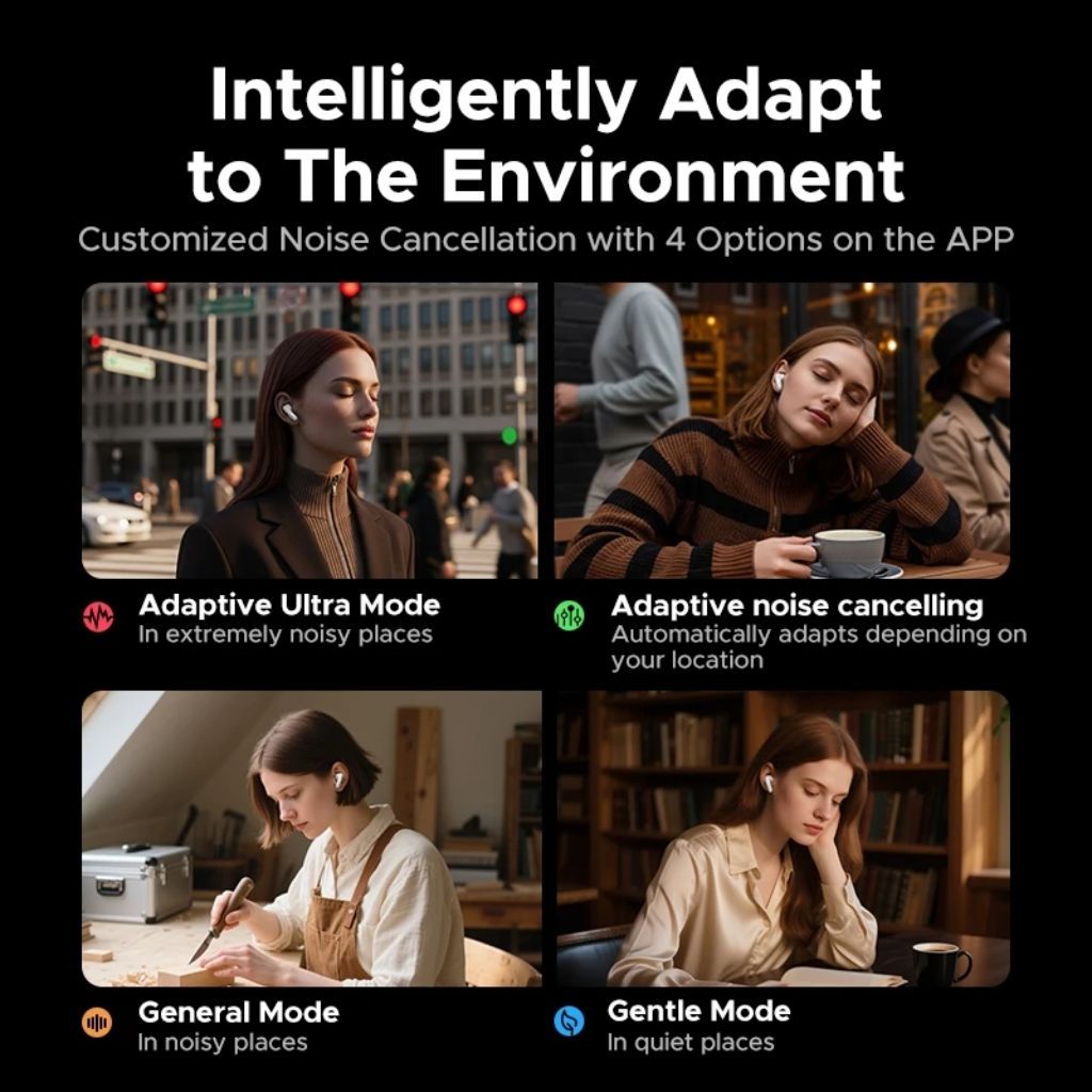 The earbuds automatically adapt to different environments, providing optimal sound and comfort wherever you are.