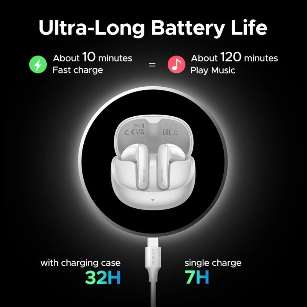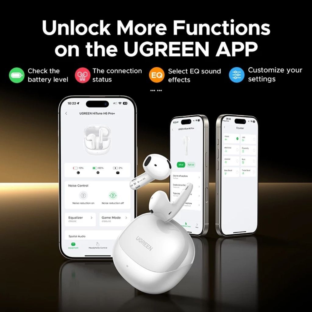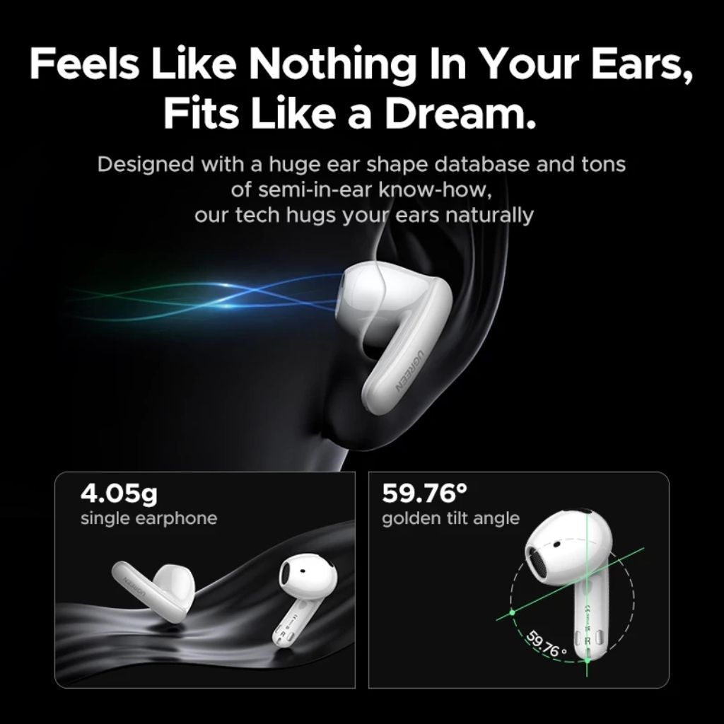 The UGREEN LightBuds Pro are semi-open true wireless earbuds designed for clear, immersive sound. With Adaptive Active Noise Cancellation (ANC), Hi-Res Audio, and Spatial Audio support, they deliver a detailed listening experience whether you’re on the move or relaxing at home.