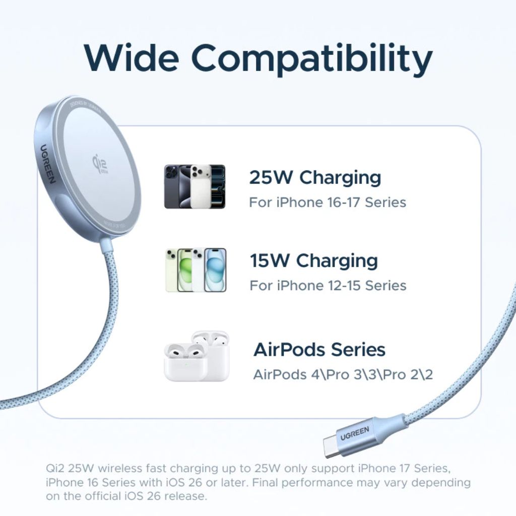 Supports iPhone 17/16/15/14/13/12 series, AirPods (Pro/3/2), and other Qi2-enabled devices. One charger covers your daily essentials.